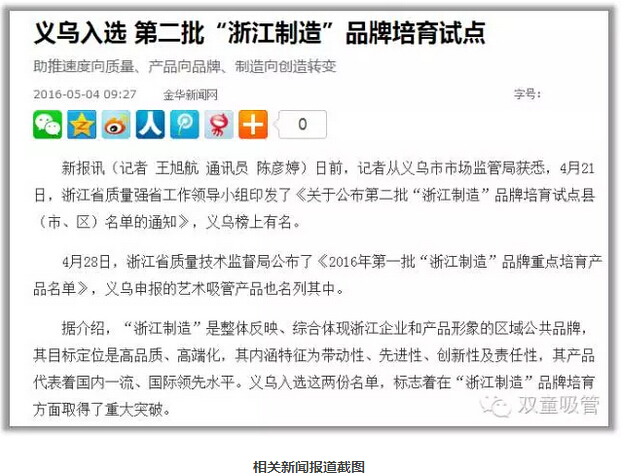 在2014年年底,浙江在全國率先以標準和認證為手段打造首個(gè)區域性公共品牌——“浙江制造”品牌。“浙江制造”標準比國家及行業(yè)標準要求要高,基本達到國際先進(jìn)、國內一流水平。4月28日,浙江省質(zhì)量技術(shù)監督局公布《2016年第一批“浙江制造”品牌重點(diǎn)培育產(chǎn)品名單》,我們“雙童”代表義烏申報的吸管產(chǎn)品名列其中。入選這份名單,標志著(zhù)義烏在“浙江制造”品牌培育方面取得了重大突破。