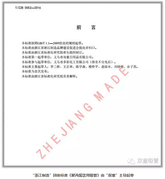 雖說(shuō)“雙童”是吸管產(chǎn)品的行業(yè)標準、國家標準和ISO國際標準的第一起草編制單位,但得知“雙童”又作為主要起草編制單位編制的“浙江制造”《聚丙烯飲用吸管》標準正式發(fā)布,吸管妞還是很激動(dòng)!因為這可不是簡(jiǎn)單的區域標準!什么樣的產(chǎn)品可以稱(chēng)為“浙江制造”?品牌需集質(zhì)量、技術(shù)、服務(wù)、信譽(yù)為一體,經(jīng)市場(chǎng)與社會(huì )公認,能代表浙江制造業(yè)先進(jìn)性的區域品牌形象標識,是浙江制造業(yè)的“標桿”和“領(lǐng)導者”,是高品質(zhì)水平的“代名詞”。