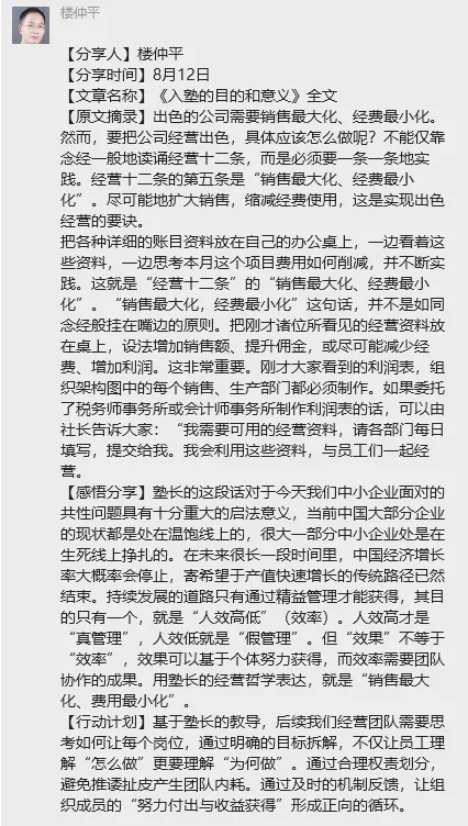 雙童塾生們也積極響應樓總的號召,每天晚上學(xué)習群里熱鬧非凡。每個(gè)人在自己學(xué)習后,還能通過(guò)其他同修的分享來(lái)拓寬視角。許多人表在碎片化的時(shí)間里難得有機會(huì )可以拿起書(shū)本學(xué)習,很高興能總結過(guò)往、共同規劃,一起成長(cháng)。