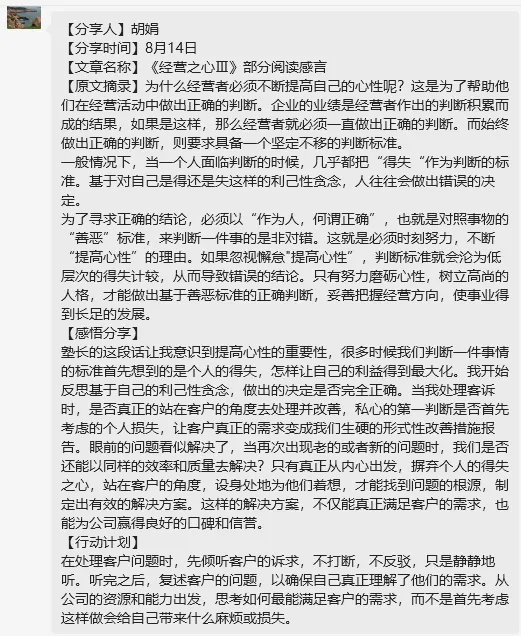 稻盛哲學(xué)首先是我們的精神食糧,讀道生的疏會(huì )接受到巨大的能量和勇氣。高深哲學(xué)是我們邁向人生幸福的必需品、營(yíng)養品,可以滋潤我們的心,促使我們提高心性,應當成為我們的工具,每天都使用。我不僅自己要、自己讀,現在還召喚我們全體進(jìn)出口員工一起看,一起交流,讓大家同頻共振,共同進(jìn)步!”