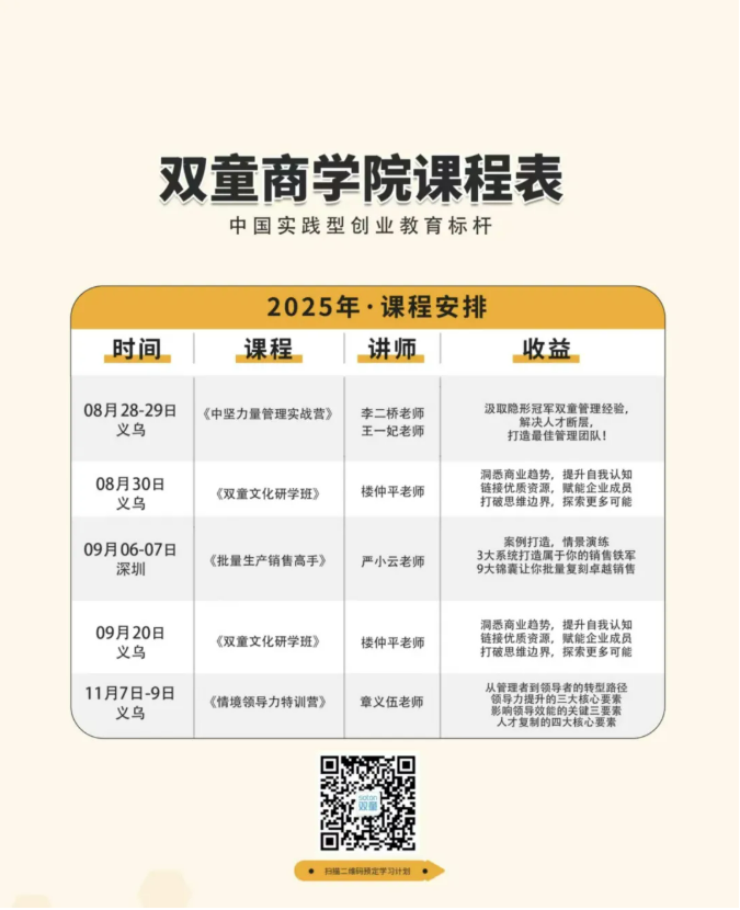 如果你也對“雙童”文化充滿(mǎn)好奇,也想賦能團隊共同成長(cháng),歡迎走進(jìn)【雙童文化研學(xué)班】,與上百位優(yōu)秀的創(chuàng )業(yè)者一起學(xué)習!少量名額,歡迎咨詢(xún)鎖定!