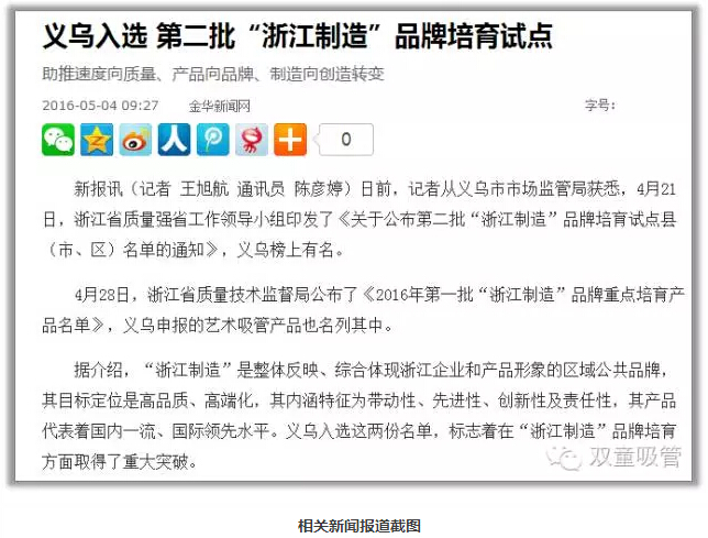 今年4月28日,省質(zhì)量技術(shù)監督局公布《2016年第一批“浙江制造”品牌重點(diǎn)培育產(chǎn)品名單》,“雙童”代表義烏申報的吸管產(chǎn)品名列其中。