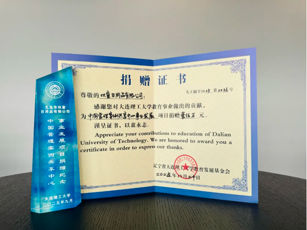 在莊重的氛圍中,捐贈方樓仲平代表義烏市雙童日用品有限公司向校方交接捐贈牌,大連理工大學(xué)黨委副書(shū)記、副校長(cháng)張言軍教授代表教育發(fā)展基金會(huì )接受捐贈,并向樓總頒發(fā)了捐贈證書(shū)與紀念獎杯。