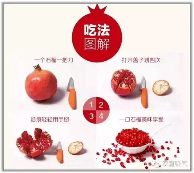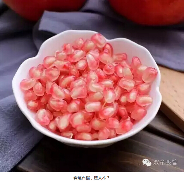 石榴可謂全身是寶:葉子可止瀉、皮曬干可補血養氣,還有疏肝柔肝、寧心定志的作用呢!石榴的寓意更是美好,有著(zhù)紅紅火火、多子多孫的寓意!要說(shuō)石榴的剝法,吸管妞做為專(zhuān)業(yè)吃貨,自然有妙招!快戳下圖↓