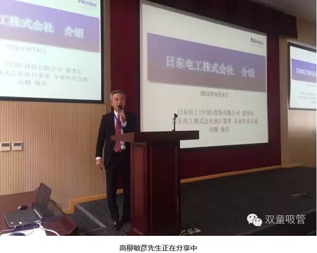 第一位分享嘉賓是連續5年被選入湯森路透全球百強創(chuàng )新企業(yè)機構2015”排名榜的日東電工(中國)投資有限公司董事長(cháng)高柳敏彥。他通過(guò)日文翻譯向在座各位作了《百年企業(yè)創(chuàng )三新之路》的演講,講解了日東電工幾十年發(fā)展歷程中如何靠一招鮮創(chuàng )新。
