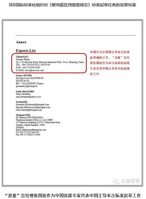 通過(guò)四年時(shí)間的努力,ISO國際標準化組織于2012年6月8日對《聚丙烯飲用吸管規范》ISO國際標準的起草編制工作進(jìn)行投票表決,并以三分之二的絕對多數獲得通過(guò),并批準以中國、泰國、瑞典、法國、南非5國組成的《聚丙烯飲用吸管規范》國際標準起草委員會(huì ),“雙童”作為當時(shí)全球最專(zhuān)業(yè)的吸管制造企業(yè)被推舉為本項國際標準的起草主席國以推進(jìn)本項標準的起草編制工作。