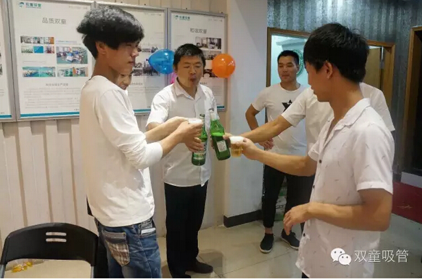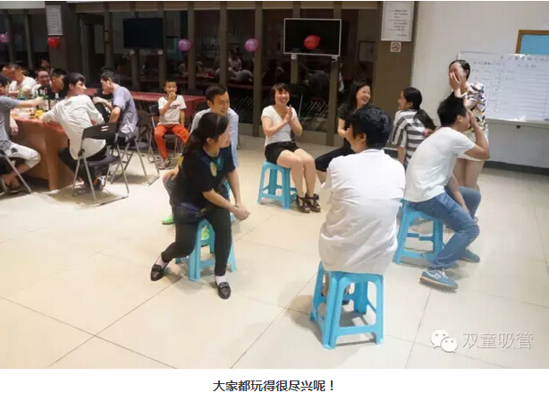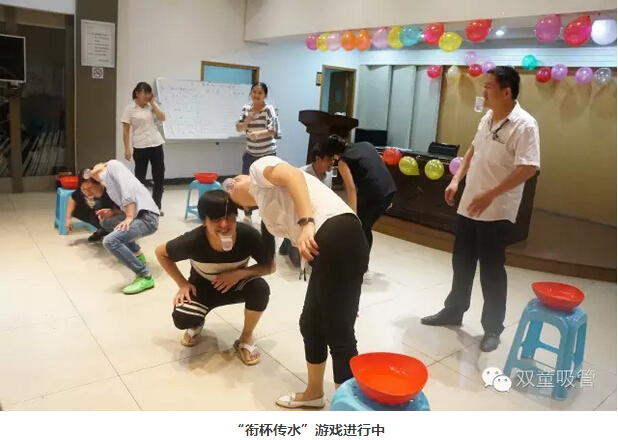 你以為這就結束了?還沒(méi)呢!接下來(lái)是重頭戲——“杯中傳情” 。員工們被分為兩隊,在相同的時(shí)間內用嘴叼杯子傳遞水,途中可不能用嘴哦!游戲好不好玩,看照片你就知道啦!