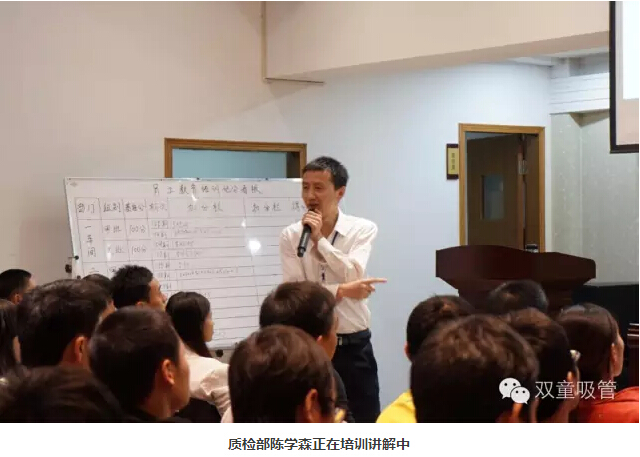 這本培訓教材出爐后,我們的各級領(lǐng)導們也專(zhuān)門(mén)對員工進(jìn)行了培訓和講解!比如,生產(chǎn)廠(chǎng)長(cháng)李秀前為大家講解成型工崗位上衛生管理、操作規范和安全管理等知識;設備科科長(cháng)姚長(cháng)東為大家講解設備的維護和保養規范;質(zhì)檢部經(jīng)理陳學(xué)森為大家講解了吸管基礎知識、吸管技術(shù)指標、外觀(guān)質(zhì)量要求等知識。