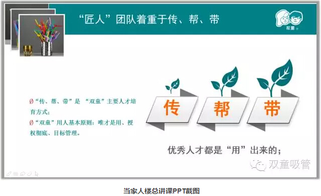 俗話(huà)說(shuō):“團隊好企業(yè)才能好”,“雙童”培養經(jīng)理人團隊成為“匠人”的方式就是“傳、幫、帶”!當初,當家人樓總把總經(jīng)理李二橋和吸管妞帶著(zhù)身邊培養,左邊坐著(zhù)吸管妞右邊坐著(zhù)總經(jīng)理李二橋,通過(guò)一起工作影響身邊的人!