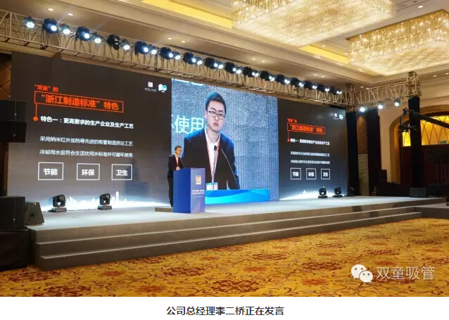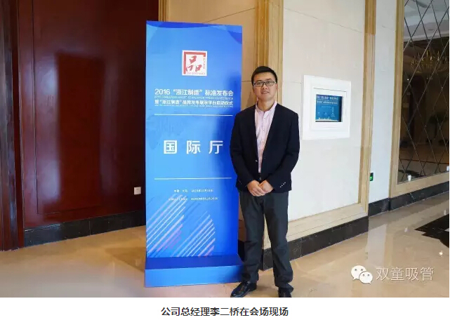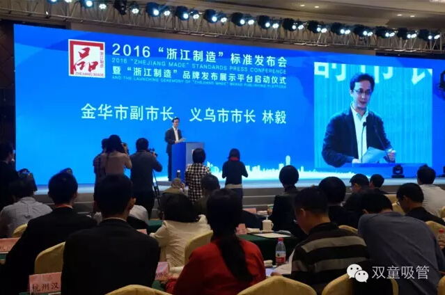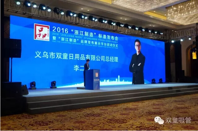11月18日,2016“浙江制造”標準發(fā)布會(huì )暨“浙江制造”品牌發(fā)布展示平臺啟動(dòng)儀式在義烏舉行,省副秘書(shū)長(cháng)陸建強、省標準委員會(huì )、質(zhì)量監督局的相關(guān)領(lǐng)導及義烏市委市政府的盛秋平書(shū)記、林毅市長(cháng)等主要領(lǐng)導都出席了本次儀式。義烏首個(gè)“浙江制造”標準研制企業(yè)雙童吸管派出了總經(jīng)理李二橋作為代表作了典型發(fā)言!
