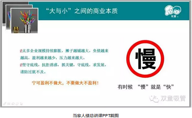 首先,當家人樓總分享了自己30多年的創(chuàng )業(yè)經(jīng)歷,在不斷失敗的教訓中,他選擇了把一根吸管做精、做細!通過(guò)二十多年積累,“雙童”初步形成了專(zhuān)注經(jīng)營(yíng)、創(chuàng )新進(jìn)取、綠色低碳、和諧共贏(yíng)和精細化管理的發(fā)展理念,“雙童”也發(fā)展的越來(lái)越好!而這些都離不開(kāi)“匠心”。社會(huì )發(fā)展也是如此,逐漸回歸“匠心”,回歸商業(yè)本質(zhì)!