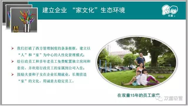 第二章,當家人樓總從自身擴大到雙童團隊,談到雙童不斷地進(jìn)行硬件改革,給員工提供最好的工作和生活環(huán)境,致力于建立家文化,鼓勵夫妻和子女在企業(yè)就業(yè),解決核心員工家庭生活問(wèn)題,長(cháng)期營(yíng)造的文化,用誠意去穩定員工!