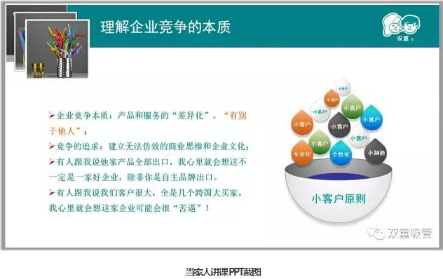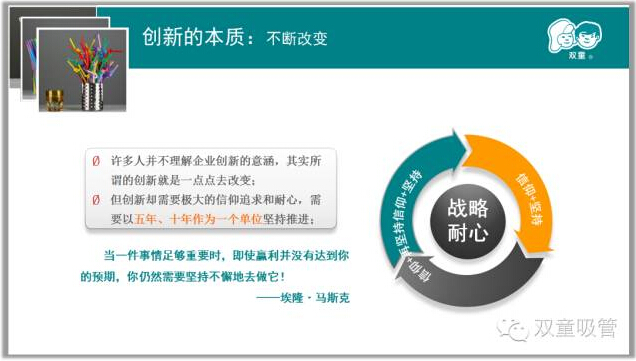 其實(shí)真正把自己的產(chǎn)品做好了,企業(yè)在一定時(shí)候擴大規模才是自然而至的,因此不要一畏地想著(zhù)大,適當做減法,寧可盈利不作大,不可做大不盈利!“雙童”的發(fā)展始終伴隨著(zhù)不斷的放棄,在自己的領(lǐng)域里細分細分再細分,把一根吸管做到極致!