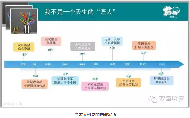 19944月,偶然的機會(huì )讓我再次選擇一根小吸管作為重新創(chuàng )業(yè)的起步,無(wú)數次的創(chuàng )業(yè)失敗使我在經(jīng)營(yíng)雙童之后選擇了更多的堅守和專(zhuān)注,從而逐漸拋棄了一夜暴富的急功近利,減少了唯利是圖的投機心理,深刻認知到創(chuàng )辦企業(yè)的意義所在,始終關(guān)注事物本身,全身心投入把事情做到更好。