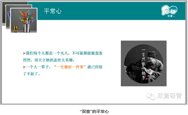 這家一次性筷子工廠(chǎng)和日本企業(yè)的綠色環(huán)保經(jīng)營(yíng)模式一直影響了我對企業(yè)和產(chǎn)品的經(jīng)營(yíng)思維,認知到通過(guò)堅持和創(chuàng )新完全可以改變企業(yè)的不變真理,從而影響了雙童在后續發(fā)展過(guò)程中始終堅守在一根吸管上,并通過(guò)專(zhuān)注不輟、精進(jìn)創(chuàng )新、用心經(jīng)營(yíng)而形成了獨具特色的雙童工匠思維,使雙童逐漸擺脫了薄利多銷(xiāo)的粗放經(jīng)營(yíng),逐步形成了精細化管理、生態(tài)環(huán)保、與員工共成長(cháng)的可持續發(fā)展道路,從而徹底改變了世人對吸管行業(yè)的低、小、散、弱的傳統認知。下面我就雙童二十多年逐漸形成的匠人思維做一個(gè)簡(jiǎn)單的總結和回顧:
