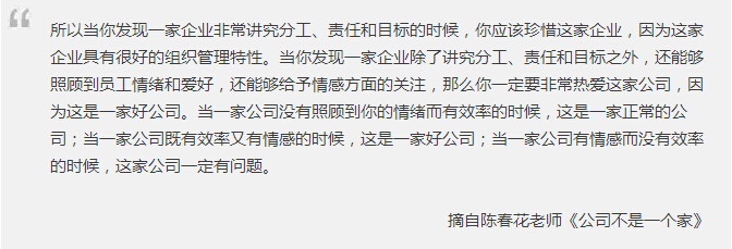 “組織不會(huì )照顧個(gè)人,也就意味著(zhù)在組織中我們是用目標、責任、權力來(lái)聯(lián)結,而不是用情感來(lái)聯(lián)結的。”