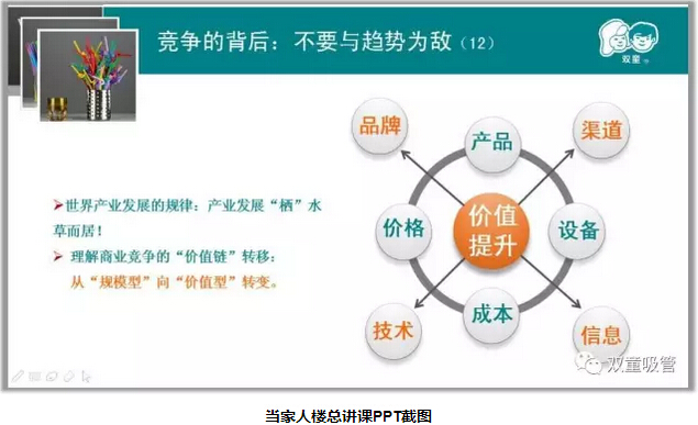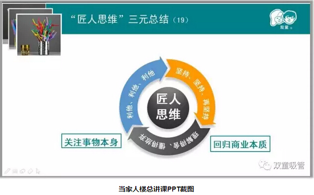 當家人樓總圍繞“匠人思維”的商業(yè)本質(zhì)、“競爭”的商業(yè)本質(zhì)兩方面進(jìn)行分享!首先當家人樓總講述了他對“匠人思維”的理解,從本質(zhì)上來(lái)講“匠人”不只是為他人著(zhù)想,更不是大公無(wú)私,而是基于理性、立足客觀(guān)、看的長(cháng)遠。只有遵循商業(yè)本質(zhì),凡事長(cháng)遠計議,以利他之心去經(jīng)營(yíng)才能把事業(yè)做好。同時(shí),當家人樓總也和大家分享了“雙童”的發(fā)展也一直圍繞著(zhù)“匠人之心”——“初心”、“恒心”、“平常心”。