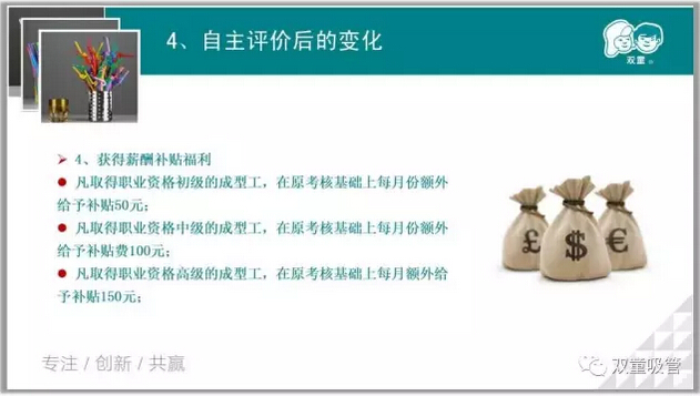 別急別急,還有呢!除了政府發(fā)布的獎勵之外,公司還將給予額外的補貼。凡取得職業(yè)資格初級的成型工,在原考核基礎上每月份額外給予補貼50元;凡取得職業(yè)資格中級的成型工,在原考核基礎上每月份額外給予補貼費100元;凡取得職業(yè)資格高級的成型工,在原考核基礎上每月額外給予補貼150元!
