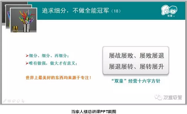 其實(shí)真正把自己的產(chǎn)品做好了,企業(yè)在一定時(shí)候擴大規模才是自然而至!“雙童”的發(fā)展始終伴隨著(zhù)不斷地放棄,在自己的領(lǐng)域里細分細分再細分,把一根吸管做到極致!在利他的基礎上不斷堅持,懂得放棄,關(guān)注事物本身,回歸商業(yè)本質(zhì)!