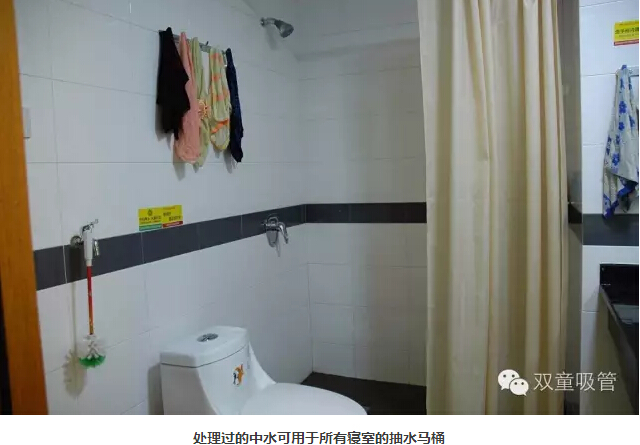 2003年,“雙童”在建設雨水收集系統的同時(shí)著(zhù)力于消滅污染和降低排放,又建設了廢水收集處理及中水回用系統,將所有的廢水進(jìn)行集中處理,并儲存備用。處理好的中水通過(guò)專(zhuān)用管道供應給所有員工寢室衛生間內的抽水馬桶、屋頂綠化、綠化噴淋和道路清洗。
