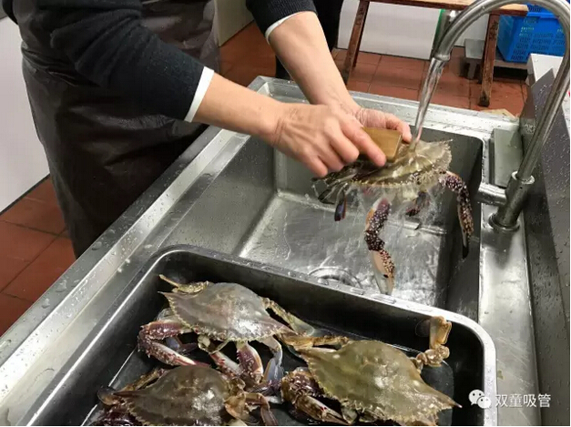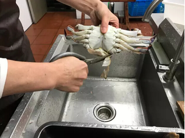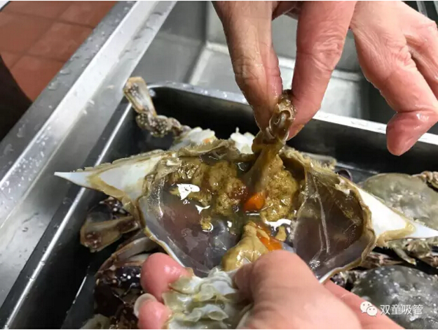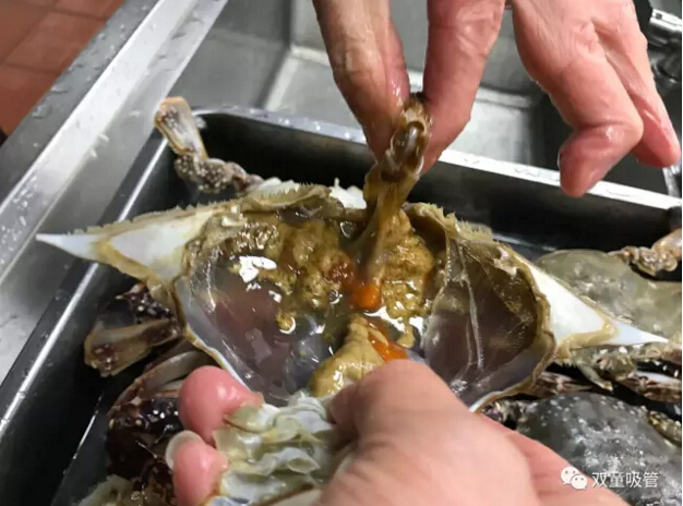 十二、取出砂囊后將蟹身兩側的蟹鰓(看上去像魚(yú)鰓)用手工拔除干凈,如果蟹鰓底部有烏黑砂子,千萬(wàn)不要用清水沖洗,用干凈牙刷局部清洗一下就可以了。