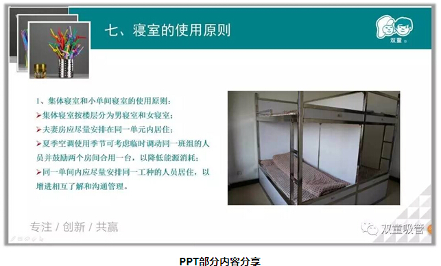張講師一開(kāi)場(chǎng)就介紹了各類(lèi)寢室的配置及安排補貼原則。瞧瞧!員工們聽(tīng)得多認真呀!一到了問(wèn)答環(huán)節,個(gè)個(gè)都很積極呢,公司的寢室分為哪幾種?具體又是怎么安排分配的?員工們都對答如流,直呼咱們“雙童”的居住環(huán)境真的很棒!是呀,“雙童”的寢室建立之初就按照三星級酒店的標準裝修,讓員工們能夠住的開(kāi)心住的舒心!