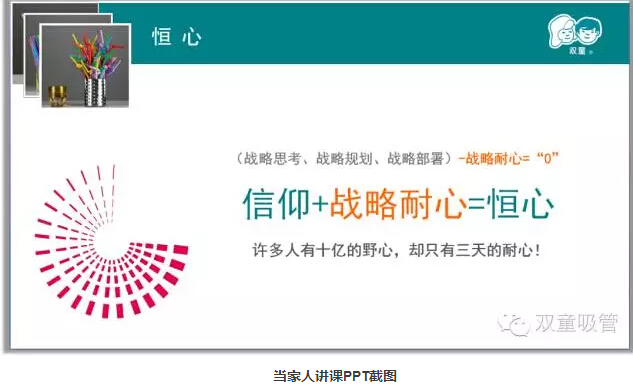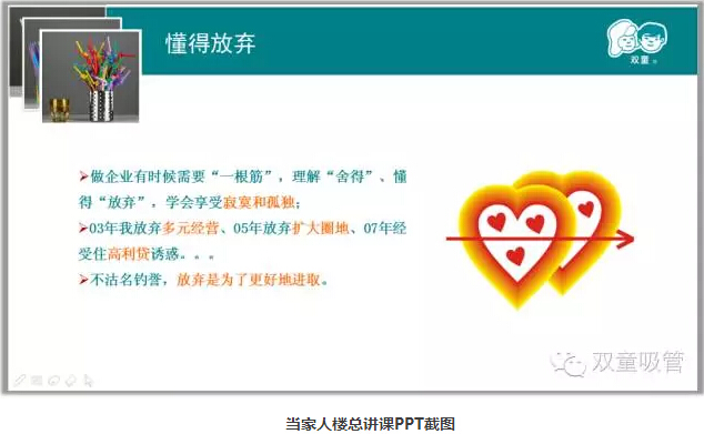 在全球經(jīng)濟形勢并不樂(lè )觀(guān)的大背景下 ,不少企業(yè)遭遇著(zhù)生存困境,有的甚至面臨倒閉。吸管妞研究后發(fā)現,大部分陷入困境的企業(yè)都有一個(gè)共同點(diǎn),就是擴張速度過(guò)快或者過(guò)度多元化。而在“雙童”發(fā)展過(guò)程中,“雙童”樓仲平一直倡導做企業(yè)要“慢”,不可貪大求全,更不能為了尋求快速發(fā)展而投機取巧。樓仲平經(jīng)常說(shuō),在一定程度上其實(shí)“慢”就是“快”!今天吸管妞就和大家一起來(lái)理解這個(gè)觀(guān)點(diǎn)!
