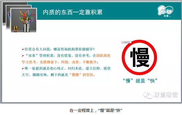 “雙童”也是一樣,不斷地積累。在團隊深度學(xué)習思考、實(shí)踐探索下,糾錯、改善、不斷提升。除了初心純正、回歸本質(zhì),腳踏實(shí)地之外,剩下的就是傻傻的堅持。不要嫌自己走得太慢,走的慢才可深入積累做更長(cháng)!在一定程度上,其實(shí)“慢”就是“快”。