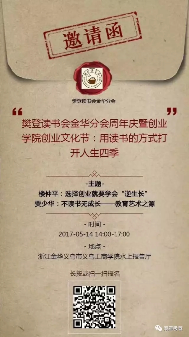 當然,如果你也對樊登讀書(shū)會(huì )有興趣,或者還有些許猶豫和疑問(wèn),沒(méi)關(guān)系!吸管妞送上驚喜福利,誠摯邀請大家免費參與5月14日(本周日)在義烏工商學(xué)院水上報告廳舉辦的樊登讀書(shū)會(huì )金華分會(huì )成立一周年慶典活動(dòng),我們“雙童”樓仲平也會(huì )參與盛典,與義烏工商學(xué)院賈少華院長(cháng)進(jìn)行專(zhuān)場(chǎng)分享!如果你是樓總的粉絲,更要參加此次盛會(huì )哦?。?/span>識別圖中二維碼即可線(xiàn)上報名哦?。?/span>