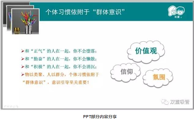 在企業(yè)中,管理的最高境界是自律,而自律就需要每個(gè)人改變自己,繼而形成高度統一的“群體意識”。因此,所有人的習慣都和企業(yè)有很大的關(guān)系,物以類(lèi)聚、人以群分,個(gè)體習慣依附于“群體意識”,意識引導至關(guān)重要!