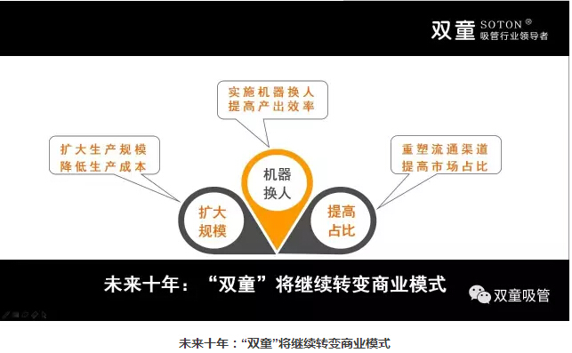 所以,未來(lái)十年,“雙童”將繼續轉變商業(yè)模式,在規模上保持適量擴張,實(shí)施機器換人提高產(chǎn)出效率,重塑流通渠道,提高市場(chǎng)占比。