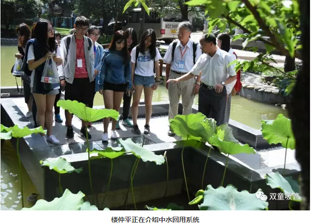 首先,大家一起參觀(guān)了中水景觀(guān)池、雨水收集池、垃圾分類(lèi)房等節能降耗系統。其實(shí),早在2003年,樓仲平就向日本學(xué)習,在建廠(chǎng)之初就把節能降耗和綠化生態(tài)想在了前面,建設了一套簡(jiǎn)單實(shí)用的節能降耗系統。這些設施不僅減少了對環(huán)境的污染,每年還為企業(yè)節省了兩三百萬(wàn)!使“雙童”成為了綠色生態(tài)、節能環(huán)保、無(wú)污染、零排放的花園式生態(tài)工廠(chǎng)。師生們紛紛表示原來(lái)以為大陸的企業(yè)都是薄利多銷(xiāo),粗放經(jīng)營(yíng),想不到“雙童”在十幾年前就有如此環(huán)保節能的理念!