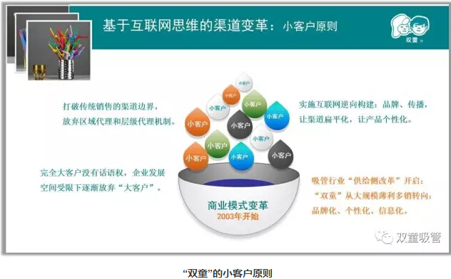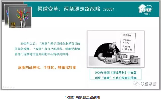 現在,“雙童”的小客戶(hù)達到了12000多家,這些寶貴的客戶(hù)客觀(guān)上與企業(yè)一直發(fā)生著(zhù)貿易關(guān)系。正是因為訂單額不大,對產(chǎn)品有個(gè)性化要求,反而造就了很高的品牌黏性,通過(guò)訂單的積累,長(cháng)期為企業(yè)創(chuàng )造著(zhù)價(jià)值。通過(guò)實(shí)施“小客戶(hù)原則”和“兩條腿走路”戰略,“雙童”在客戶(hù)數量提高的同時(shí)風(fēng)險大大下降,從而抓住了企業(yè)的主動(dòng)權,帶動(dòng)品牌的提升!