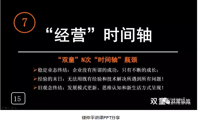 “經(jīng)營(yíng)”時(shí)間軸:樓仲平也用“雙童”的發(fā)展史告訴大家經(jīng)營(yíng)也是有時(shí)間軸的,會(huì )遇到瓶頸和“天花板”。企業(yè)沒(méi)有所謂的成功,只有不斷的成長(cháng),我們無(wú)法用既有經(jīng)驗和技術(shù)解決所遇到所有問(wèn)題!