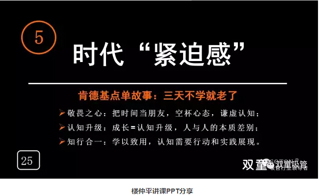 時(shí)代“緊迫感”:“雙童”樓仲平在時(shí)隔幾天去肯德基時(shí),發(fā)現肯德基已經(jīng)在自助點(diǎn)單了,而自己還在傻傻的等工作人員點(diǎn)餐!這也告訴我們要不斷地學(xué)習,三天不學(xué)你就老了!舊觀(guān)念終結,發(fā)展模式層出不窮,新的生活方式不斷呈現,行業(yè)變化之快,超出想象,如果你不學(xué)習就要被淘汰,你就“老了”!