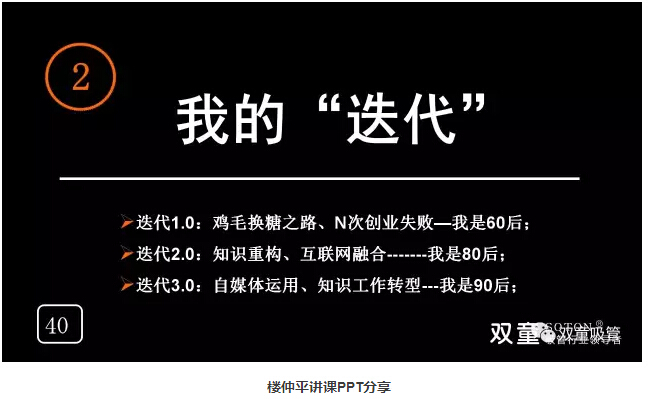 我的“迭代”:“雙童”樓仲平通過(guò)自身不斷的學(xué)習:在浙大學(xué)習進(jìn)修、學(xué)習電腦設計,認知到自媒體作用,與年輕人鏈接、培養團隊,自己轉變教育工作……不斷否認自我、重新認知,實(shí)現迭代!