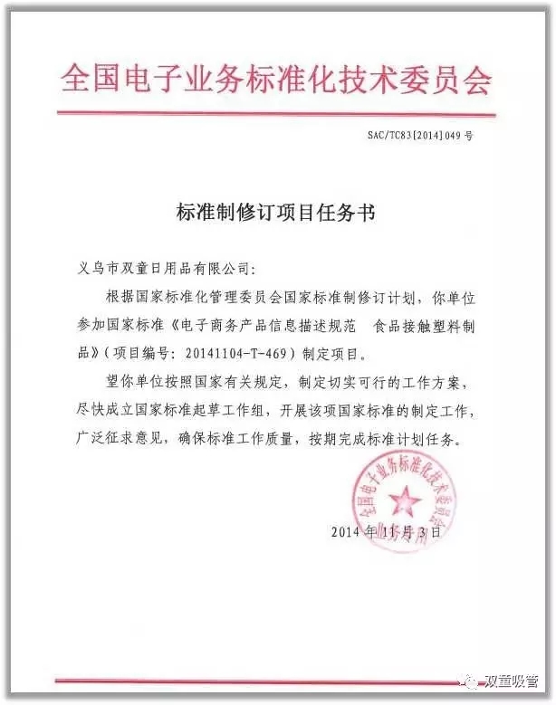 除了此項國家標準的制定之外,“雙童”還主導制定了《聚丙烯飲用吸管》中國國家標準等4項國家級標準。這在中國的中小企業(yè)中絕無(wú)僅有,“雙童”是第一家!接下來(lái),吸管妞就向大家介紹“雙童”的“國家標準制定之路”吧!