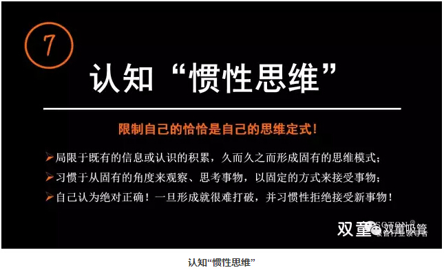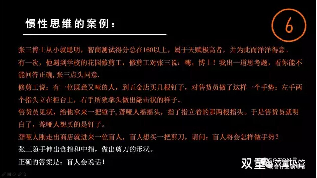 樓仲平通過(guò)“盲人買(mǎi)剪刀”及“吵架”兩個(gè)小案例和大家分享了認知“慣性思維”:“我們常常會(huì )局限于既有的信息或認識的積累,習慣于從固有的角度來(lái)觀(guān)察、思考事物。這種思維一旦形成就很難打破,并習慣性拒絕接受新事物,久而久之形成固有的思維模式!所以,很多時(shí)候限制自己的恰恰是自己的思維定式,我們要跳出自己的思維定式!”