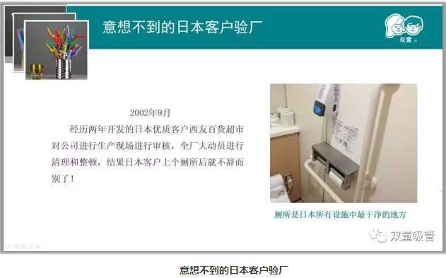 “2003年,我們著(zhù)手開(kāi)發(fā)日本市場(chǎng),聯(lián)系了很長(cháng)時(shí)間,終于找到了一家大客戶(hù),同意先來(lái)驗廠(chǎng)。當時(shí)‘雙童’是租的廠(chǎng)房,全廠(chǎng)上下把里里外外每臺機器刷了一遍油漆,地面、屋頂都收拾干凈妥當。結果,客戶(hù)來(lái)了,上了個(gè)洗手間就走了,連車(chē)間都沒(méi)有進(jìn)去?!彪S行的日本翻譯告訴樓仲平,“你們那么臟,人家就不看了?!?/span>