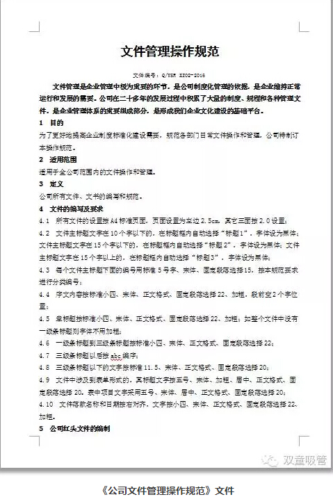 通過(guò)這份文件,我們統一了企業(yè)文件的編寫(xiě)要求,從而明確指導各部門(mén)在形成、修訂、補充和更新文件時(shí)的統一規范!換句話(huà)說(shuō),無(wú)論是“雙童”多少位科室員工寫(xiě)的文件,打開(kāi)一看都像是一個(gè)人寫(xiě)的文件!