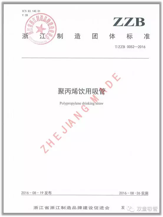 2016年4月28日,《聚丙烯飲用吸管》浙江制造團體標準正式立項,并由“雙童”承擔編制起草工作。2016年8月26日,《聚丙烯飲用吸管》浙江制造團體標準正式發(fā)布實(shí)施?!半p童”成為了吸管行業(yè)首家通過(guò)產(chǎn)品認證的企業(yè)。這標志著(zhù)“雙童”產(chǎn)品質(zhì)量達到國內一流、國際先進(jìn)又一強有力證明,為推動(dòng)浙江制造品牌建設起到了良好的推動(dòng)及帶頭作用。