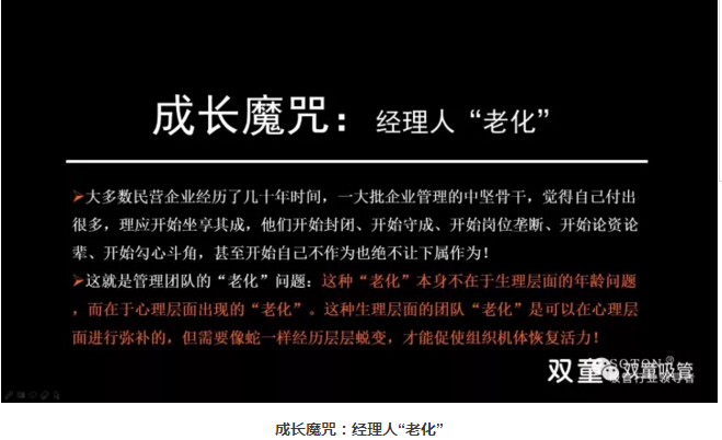 “雙童”創(chuàng )辦初期聘任部分原國營(yíng)企業(yè)的下崗管理層,這些人客觀(guān)上在企業(yè)發(fā)展中做出了巨大的貢獻。但到了2010年前后,其中的大部分管理層逐漸出現了“認知時(shí)間軸瓶頸”:他們依托于習慣思維,完全憑經(jīng)驗用老方法解決新問(wèn)題,不愿意學(xué)習,創(chuàng )新意識低下,抵制變革,拒絕接受和應用新興事物,團隊的成長(cháng)遇到了瓶頸。
