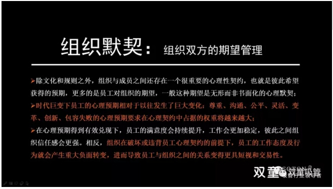 除了文化和規則之外,組織與成員之間還存在一個(gè)很重要的心理性契約,也就是彼此希望獲得的預期,更多的是員工對組織的期望。在心理預期得到有效兌現下,員工的滿(mǎn)意度會(huì )持續提升,工作會(huì )更加穩定,彼此之間組織信任感會(huì )更強。