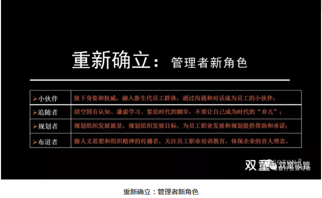 追隨者:管理者應清空固有認知,謙虛向年輕人學(xué)習,緊追時(shí)代步伐,不要讓自己成為時(shí)代的“棄兒”;