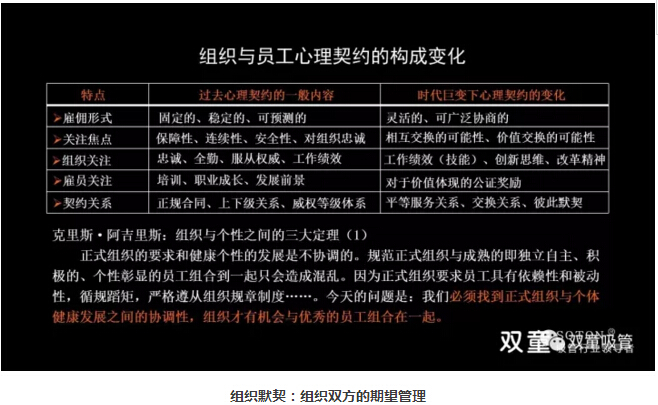 組織默契,組織雙方的期望管理:除了文化和規則之外,組織與成員之間還存在一個(gè)很重要的心理性契約,也就是彼此希望獲得的預期,更多的是員工對組織的期望。