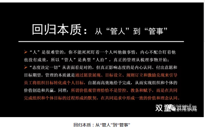 管理的本質(zhì)是“管事”而非“管人”:很多管理者把管理當成一種工具,認為管理是用來(lái)操控的,就必須操縱控制員工的行為。其實(shí),“人”是很難管的,你不能死死盯著(zhù)一個(gè)人叫他做事情,員工內心不配合盯著(zhù)他也沒(méi)有成效,“管人”是典型“人治”,真正的管理從梳理事物開(kāi)始。所以,管理的本質(zhì)管理不是管控、教條和賦予,而是在共同完成組織和個(gè)體目標的過(guò)程形成的默契,在共同追求中形成一致的價(jià)值和理念認同。