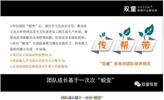 “雙童”選擇了主動(dòng)“蛻變”:基于上述瓶頸,公司在2011年發(fā)布了第三個(gè)《企業(yè)五年發(fā)展規劃》,明確“再造經(jīng)理人”計劃,明確領(lǐng)導層更替:選拔培養年輕領(lǐng)導層、重要崗位領(lǐng)導年輕化、明確實(shí)施股份制改革,慢慢解決管理層老化問(wèn)題!重組后的“雙童”團隊平均年齡不到三十歲,大部分核心團隊的工齡在十年以上,學(xué)歷、知識層次和忠誠度大幅提高!