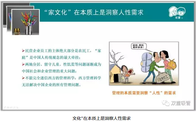 通過(guò)上述事件,“雙童”逐漸認知到:“家”是員工最大的牽掛,只有內心沒(méi)有太多牽掛,情緒沒(méi)有太大波動(dòng)的員工,才能生產(chǎn)出優(yōu)質(zhì)產(chǎn)品!正所謂“人心”最難管,員工沒(méi)有了牽掛,才能全身心投入到工作當中,才能做出更加完美精細的產(chǎn)品!因此,從2005年9月開(kāi)始,“雙童”明確把“家文化”作為員工管理的著(zhù)力點(diǎn),以“小家”形成“大家”,凝聚團隊“人心”!