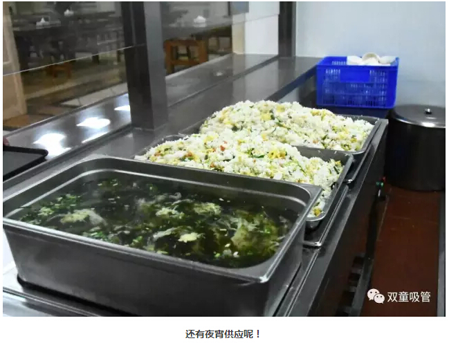 中餐和晚餐就更加豐盛啦,都是三菜一湯的標準。一葷兩素營(yíng)養搭配,每天都不一樣哦!夜宵則有蛋炒飯、紫菜雞蛋湯、面條…… 晚上11點(diǎn)還有營(yíng)養的夜宵供應,員工們進(jìn)了“雙童”可得胖三斤呀!