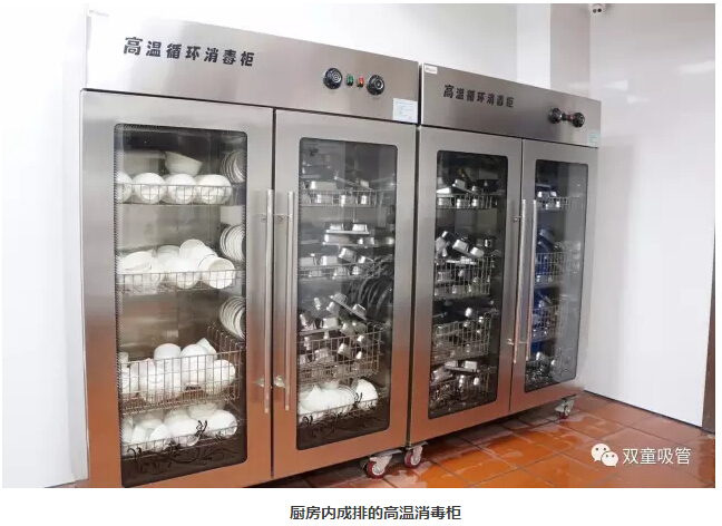 清洗好后的餐具全部放入消毒柜中高溫消毒110分鐘后,才可取出使用,保證餐具的干凈衛生!